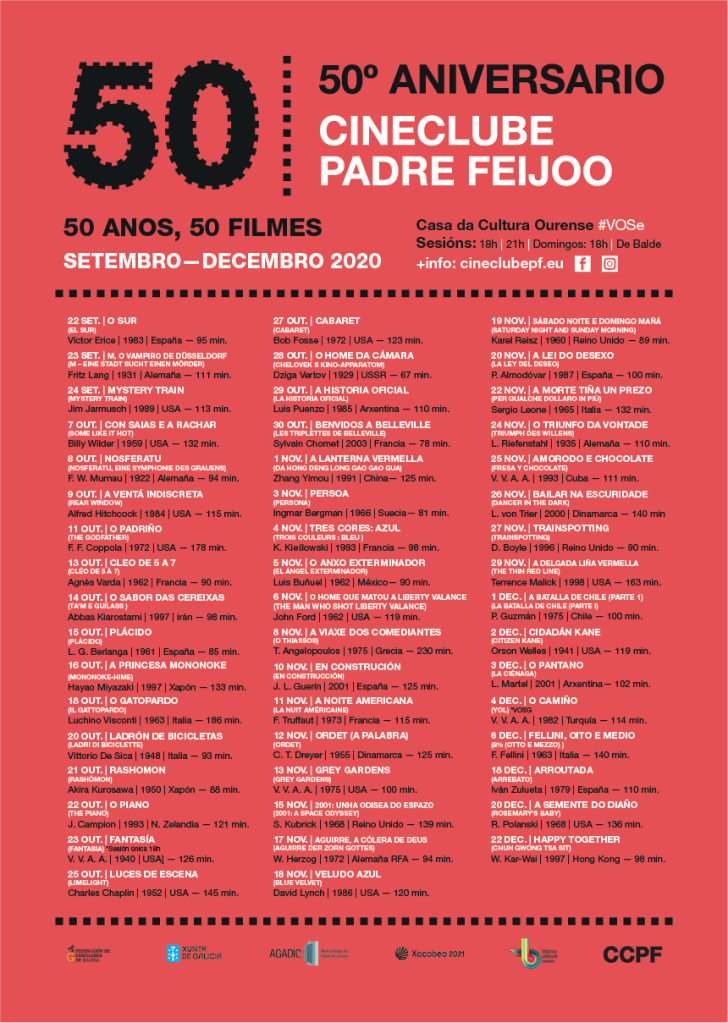 El de Ourense, el Cine club Padre Feijóo cumple 50 años a lo grande, con una programación especial a modo de grande bouffe cinéfila de dos meses de duración; mientras, el de Pontevedra, el más antiguo de los cine clubs gallegos consolida una programación versátil, retrospectiva y vanguardista a partes iguales.